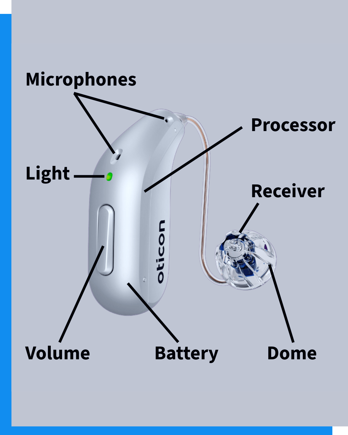Receiver / Speaker: Delivers the processed sound into the ear.